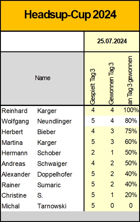 Für die Gesamtwertung fehlen noch zahlreiche Spiele. Mindestens 10 Matches muss man bis Jahresende absolviert haben, um Anspruch auf die Medaille zu haben. Das haben bisher erst zwei Leute geschafft. Beim nächsten Headsup-Abend am 3. September werden aber sicher noch etliche Kandidaten dazukommen.