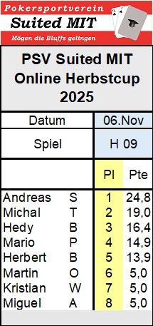 Drei Runden sind noch zu spielen. Hoffentlich erwacht die Spielfreude wieder, damit künftig wieder mehr los ist beim Online Herbstcup.