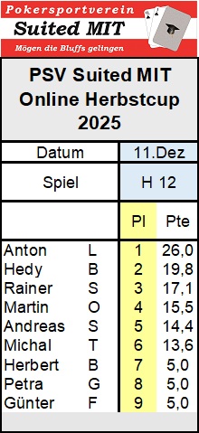 Der Online-Herbstmeister 2025 steht fest. Diesmal hat es für Herbert B. gereicht. Vier Siege und ein zweiter Platz waren dafür verantwortlich. Obwohl Herbert das letzte Spiel vermurkst hat konnte ihm nichts mehr passieren.