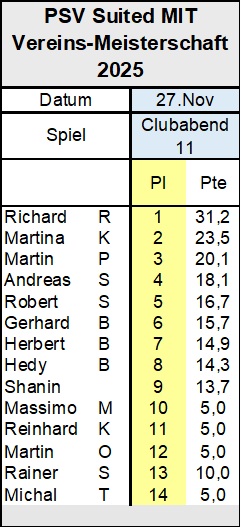 Jetzt ist einmal Weihnachtspause. Am 15. Jänner beginnt mit dem ersten Clubabend 2026 alles wieder von vorne. Neue Saison - neue Chance. Die Vereinsmeister 2025 werden am 13. Dezember anlässlich der Weihnachtsfeier gebührend geehrt.