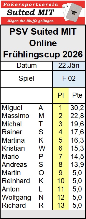 Wir sehen einander alle am 29. Jänner zum Online Frühlingscup Spiel #3.