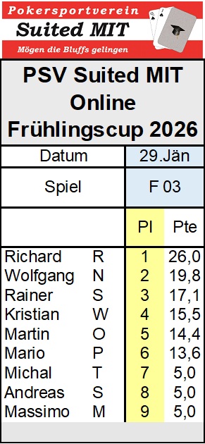 Neun Turniere sind noch ausständig, sodass noch alles möglich ist. Am 5. Februar geht es mit Spiel #4 weiter. Kommt alle.