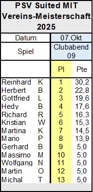 So sind Andreas S und Robert S. dem Turnier ferngeblieben und konnten trotzdem die Plätze Eins und Zwei behalten. Dritter ist - trotz frühem Ausscheiden bei Spiel Neun - unverändert Gerhard B. Dreizehn Leute haben am letzten Dienstag mitgespielt. Besonders gefreut hat uns, dass zwei neue Mitglieder mit dabei waren und nicht nur das, sie haben mit einem 5. Platz (Richard R.) und dem 6. Platz (Kristian W.) schöne Einstiegs-Erfolge gezeigt und die Alteingesessenen mächtig ins Schwitzen gebracht.