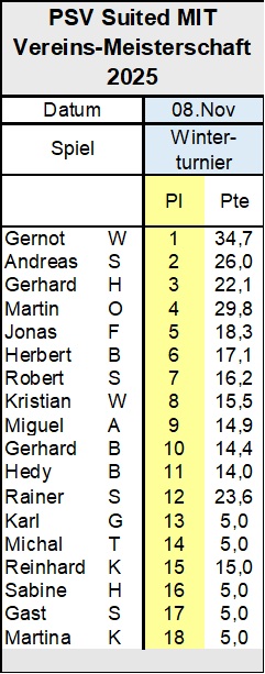 Auf Silber liegt Robert S. Auch die zwei Abnede, an denen er aussetzen musste, haben ihm nicht geschadet. Auf Bronze liegt eine Runde vor Saisonende Gerhard B. Bei den Plätzen Zwei und Drei allerdings kann es noch Bewegung geben. Auf jeden Fall wird das letzte Turnier am 27. November spannend bleiben.